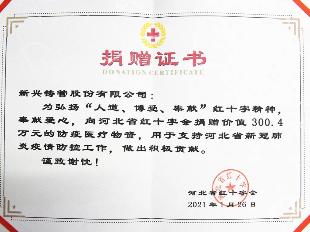 河北省紅十字會(huì)向公司發(fā)來捐贈(zèng)證書及感謝信